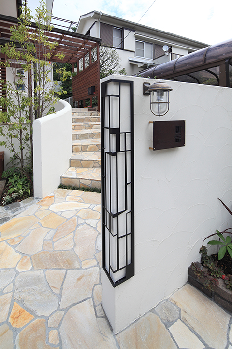 My Renovation Style新築されたT様邸のエクステリア工事。既製品を出来るだけ排し、自然素材を中心にアンティーク感漂う仕上がりをご要望。石材・木材・鋳物などを主体に各素材をどのように散りばめ、素敵な雰囲気に仕上げるかが今回の重農なテーマでした。