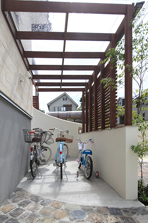 袖壁を境に後ろ建物側を自転車置き場に。道路からの視線を遮るルーバーフェンスと雨対策の屋根を設置。
