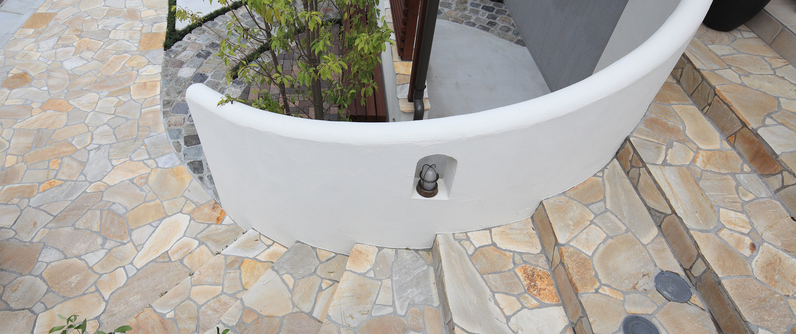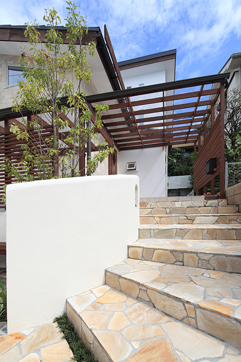 素材の色を上手に引き出してくれる「白の塗り壁」。直線と曲線を交えた塀は、シンボルツリーを中心に包み込むように立ち、その曲線に沿ってアプローチ階段はゆったりと登っていきます。