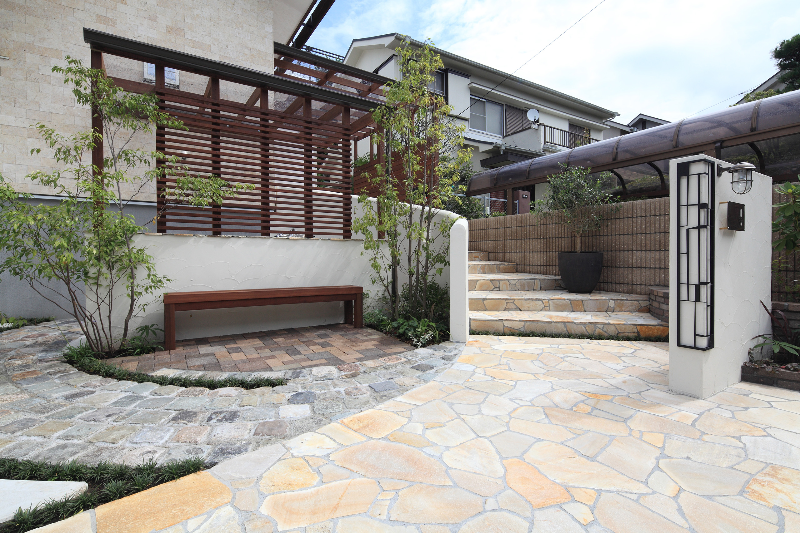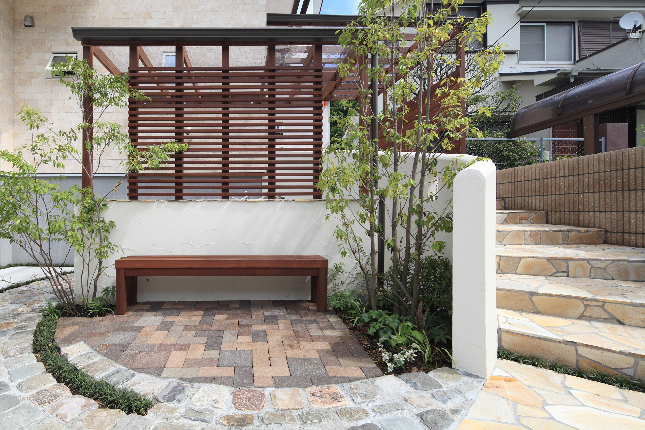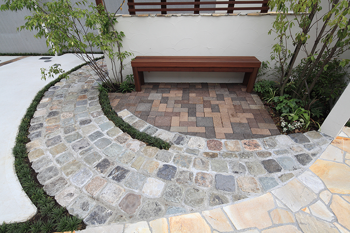 道路から階段へ続く乱石のアプローチ。その一角に、スウェーデン産のスベリストーンを使用したヨーロッパの石畳を思わせるアールの舗装で囲んだ空間を造りました。アンティークレンガを敷き詰めたその上にはベンチを設置。来訪者を優しく迎い入れます。まさに「遊歩道の休憩スペース」のように。